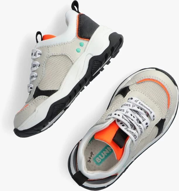 Deze stoere lage sneakertjes CHARLY CHUNKY komen uit de stap collectie van het merk BUNNIES JR. Dit model is geschikt voor kindjes die het stappen al aardig onder de knie hebben en dus baat hebben bij een wat steviger schoentje maar nog wel met een flexibel zooltje voor een gemakkelijke afwikkeling van de voet. De buitenkant is gemaakt van beige leer en heeft zwarte overlays. een oranje tong en bijpassende oranje details. De oranje tong is evenals de hiel voorzien van een textiel aantreklusje. Extra leuk zijn de platte veters met zwart merkopdruk en de wit met zwarte rubberen zool met chunky vormen voor een stoere look. Het binnenwerk heeft een leren voering met een uitneembaar voetbed en de loopzool is gemaakt van rubber met een gripvast profiel.