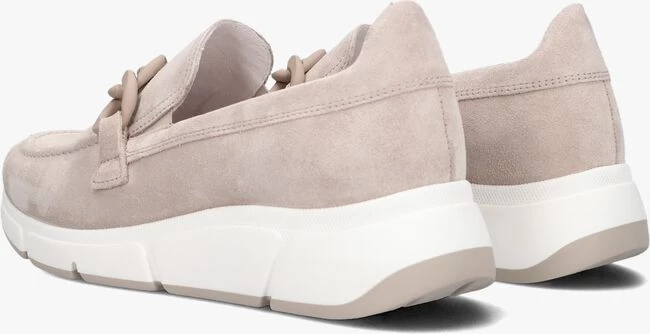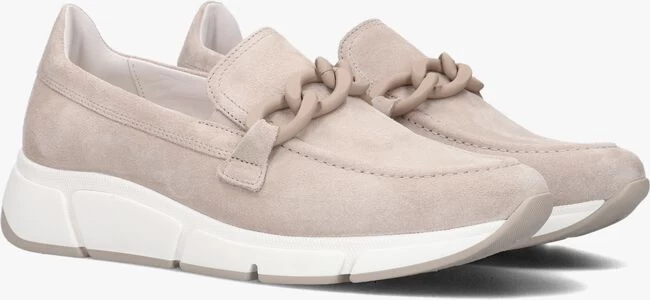 Deze loafer met sportieve sneaker zool komt uit de collectie van het merk Gabor. Hij is uitgevoerd in beige suède en heeft een opvallende schakelketting op de wreef. Leuk is de opstaande naad op de neus en de sportieve, chunky zool met beige loopzool die deze schoen een stoere look geeft. De zool is twee centimeter hoog onder de voorvoet en loopt naar achteren toe op tot ruim 4 centimeter. Het binnenwerk is gemaakt van textiel in combinatie met leer en het voetbed is uitneembaar. Draag deze loafers onder een jeans, jurk of rok en loop er zowel stijlvol als comfortabel bij!