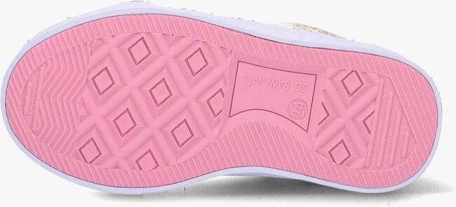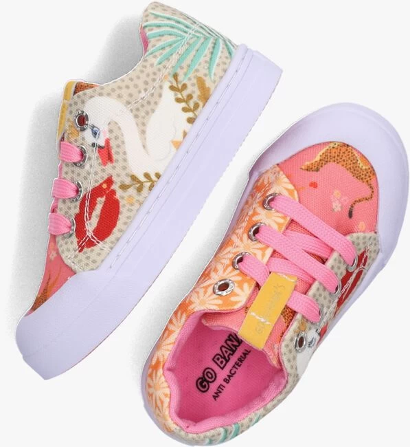GO BANANAS! Dat gaat zeker lukken met deze leuke lage sneakers SWANKISS uit de collectie van dit vrolijke merk, die op ieders gezicht een lach weet te toveren. De buitenkant is gemaakt van canvas textiel in de kleuren oranje, roze en beige en is voorzien van diverse prints. Zo vind je aan de ene kant een beige en groene print met een witte zwaan en kussende rode lippen, aan de andere kant een oranje bloemen print en op de neus en tong een roze print met een stoere luipaarden. Leuk detail is het banaantje achterop de hiel. Op de tong prijkt een geel lederlook label met goudkleurig merkopdruk en de platte roze veters maken het helemaal af. Extra handig is de witte rubberen stootneus, hierdoor kan de schoen tegen een stootje en blijft de schoen langer mooi. Want bij het klim en klauteren, buitenspelen of een potje voetballen mag niets in de weg staan! Het binnenwerk heeft een canvas voering en een uitneembaar voetbed. De roze loopzool is voorzien van een gripvast profiel. Â
