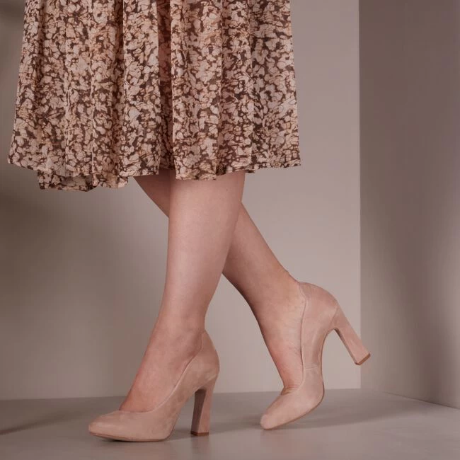 Een vrouwelijke pump met een prettig comfort en een slank design, dat is deze high heel pump PASCUAL van het merk UNISA! Dit beige model maakt jouw outfit helemaal af en heeft mooie kenmerken die jouw vrouwelijkheid extra benadrukken zoals de ronde uitsnijding op de voorvoet, het ronde neusje, het verhoogde achterpand en de hoge, smalle blokhak. Dit model is uitgevoerd in zacht suède met een leren binnenvoering en een vast voetbed met licht dempende schuimlaag. De blokhak is 10 centimeter hoog, maar door het ingebouwde plateau onder de voorvoet van bijna 2 centimeter dik loopt deze pump toch erg comfortabel. En dankzij de flexibele TPU-antislipzool heb je een goede grip bij iedere stap. Combineer ‘m bij een korte jurk of een fijne broek!  Â