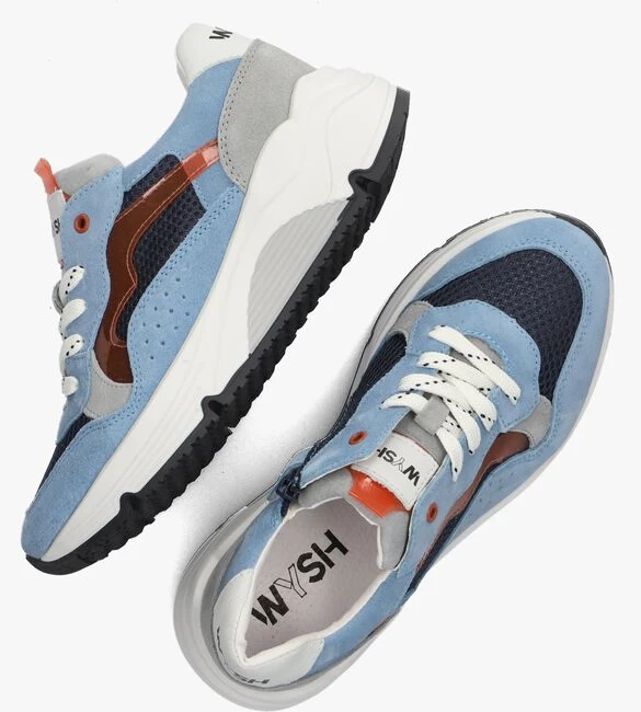 Hét nieuwe schoenenmerk voor coole kids, WYSH, staat voor Wear Your SHoes en is voor eigenwijze types die hun eigen stijl volgen. Oftewel, doe je ding! Draag op ieder moment de schoenen die jij wil, op iedere manier die jij tof vindt. De trendy modellen zijn uitgevoerd in hoogwaardige materialen en zijn met zorg ontworpen voor snel groeiende voeten. Dit lage sneaker model WILKO is uitgevoerd in suède in combinatie met panelen van mesh en leer in een mooie blauwe kleur. Daarnaast heeft de schoen donkerblauw mesh op de neus en zijkant en een opvallend, transparant oranje paneel op de zijkant en tong. Het binnenwerk heeft een gecombineerde voering van leer en lederlook materiaal met een uitneembaar voetbed. Op de tong is een wit leder merklabel te vinden, de hielkap heeft een merkopdruk en de witte veters zijn gesierd met zwarte stiksels. De chunky rubberen zool zorgt voor een stoere look en de zwarte loopzool is voorzien van een gripvast profiel voor veel grip bij het rennen en spelen. Durf eigenwijs te zijn met WYSH!