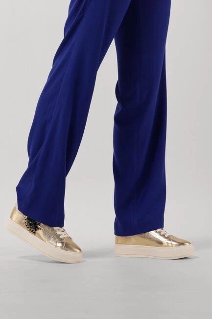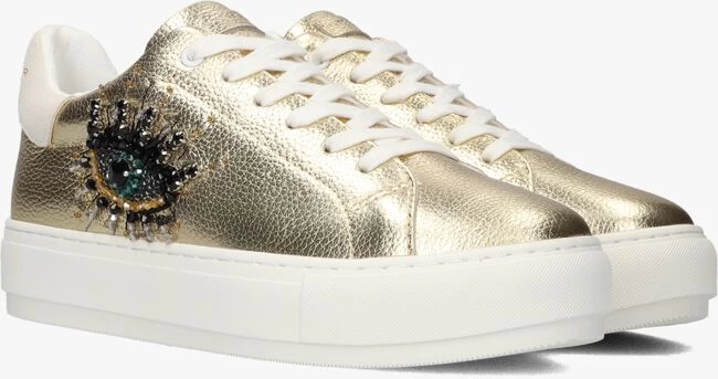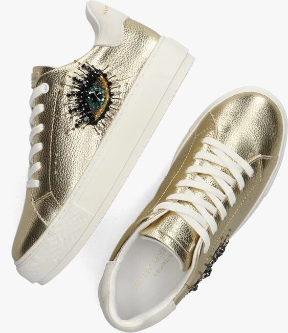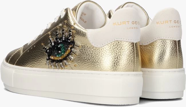Het innovatieve en creatieve merk Kurt Geiger London is ontstaan in de bruisende straten van Londen, hier halen zij hun inspiratie vandaan en begint hun creatieve proces. Zo maken ze al meer dan 50 jaar unieke ontwerpen waarbij de regenboogkleuren centraal staan in hun vele ontwerpen. Deze lage sneaker is een echte eyecatcher! Het bovenwerk is gemaakt van goudkleurig, gestructureerd leer en heeft aan de zijkant een oog met verschillende kraaltjes. Andere opvallende details zijn de witte veters en de suède hielcap met goudkleurig merkreliëf. De sneaker is gevoerd met wit textiel en het uitneembare voetbed is gemaakt van wit leatherlook. De rubberen zool heeft een hoogte van 4 centimeter en heeft een fijn lijntjesprofiel. Draag dit opvallende model onder een toffe jeans!
