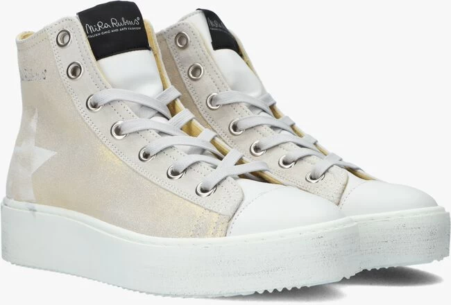 Ben je opzoek naar een vernieuwende hoge sneaker dan ben je met deze sneaker LONG ISLAND van het merk NIRA RUBENS aan het juiste adres. Dit merk heeft een voorliefde voor toffe prints, kleuren en handgemaakte tekeningen, die door ambachtslieden op de schoenen afgebeeld worden. Je herkent de sneakers aan het kenmerkende hart of ster symbool. Deze sneaker heeft een opvallend bovenwerk van gelamineerd leer met een chique goudkleurige glans en een witte lederen tong met textiel merklabel. Alsof dat nog niet genoeg is, is de zijkant gesierd met een handgeschilderde ster en merkreliëf en vind je achter op de hiel suède tape met panterprint opdruk. Met de handige rits aan de binnenzijde van de sneaker trek je ‘m gemakkelijk aan-en uit en hoef je niet iedere keer de veters te strikken. De witte plateauzool is maar liefst 4 centimeter hoog onder de hiel en is gemaakt van rubber met een used look met merkreliëf achter op de zoolrand. Het binnenwerk is gevoerd met canvas textiel en heeft een uitneembaar voetbed van leer. Combineer ’m met een toffe mom jeans en je favoriete top of een jurkje voor een nonchalante en casual look.