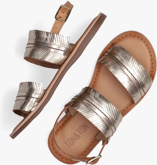Op deze toffe sandalen zie je je kleine meid toch al op rondstappen. Dit model PL_OM005-A komt uit de collectie van het toffe merk TON & TON. Schoenen van dit merk zijn stevig en hebben een goede kwaliteit. De buitenkant is van metallic goud leer met toffe franjes en met gespje op het enkelbandje pas je ‘m perfect aan naar het voetje van jouw kind en is hij gemakkelijk aan en uit te doen. Het binnenwerk is gemaakt van een zacht leren met een gevoerde zool die zorgt voor een goede demping en fijn draagcomfort. De loopzool is gemaakt van rubber en heeft een lief vlindertjes profiel. Â