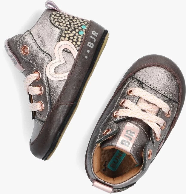 Daar gaat je kleine meid, ze zet haar eerste stapjes of begint te staan! Tijd om nu haar allereerste schoentjes uit te zoeken. Naast dat ze er natuurlijk heel leuk uit moeten zien, moeten ze ook flexibel zijn en een goede steun en grip geven. Dit hoge sneaker model ZUSJE ZACHT van het Nederlandse merk Bunnies JR heeft het allemaal. Ze zien er gaaf uit dankzij de zilverkleurige leren buitenkant met roze kleurige accenten. Aan de hiel vind je de kenmerkende Bunnies stippen, de hiel heeft een roze kleurige hielband en de tong van leer heeft een bijpassend merklabel. Extra leuk zijn de hartjes applicaties van rozekleurig leer en ponyhair en de veters met glitter details. De voering is gemaakt van leer en heeft een uitneembaar voetbed. Het rubberen super flexibele zooltje buigt mee met het voetje voor een goede afwikkeling én ontwikkeling van het voetje en heeft een anti-slip profiel. Met deze toffe schoentjes is je kindje helemaal klaar voor deze nieuwe spannende fase!