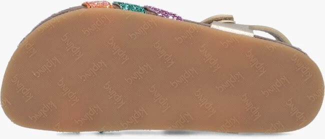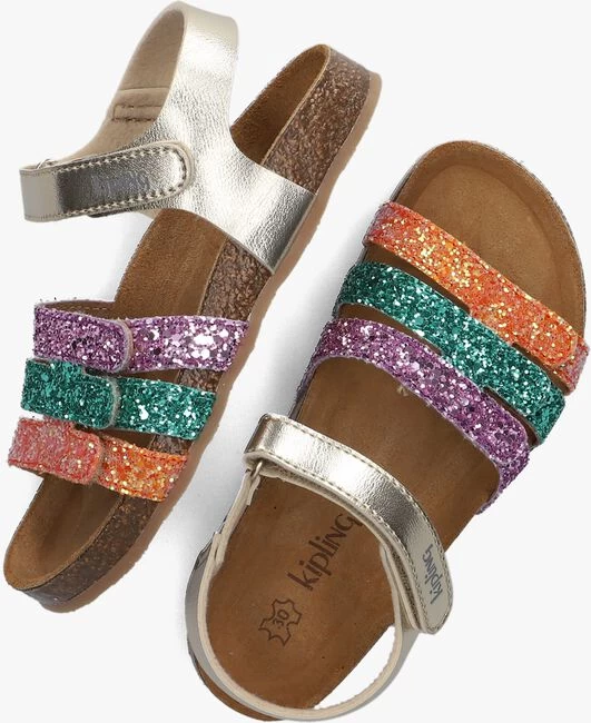 Deze toffe MAYA sandaal van het merk Kipling is hip én comfortabel! Dit model is uitgevoerd in goudkleurig leatherlook in combinatie met drie bandjes over de voorvoet in paarse, groene en oranje glitters. Alle bandjes zijn voorzien van een klittenbandsluiting waarmee je de sandaal goed passend maakt naar de voet. Het suède voetbed is voorgevormd en zorgt voor veel comfort en ondersteuning in de voetholte. De textiel voering van de bandjes voelt zacht aan op de voet en het kurk in de tussenzool zorgt voor een optimale demping. De lichtbruine loopzool met merkopdrukkenprofiel is gemaakt van rubber voor een goede grip. Bij de sandaal wordt ook het welbekende, superleuke Kipling-aapje geleverd!