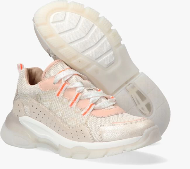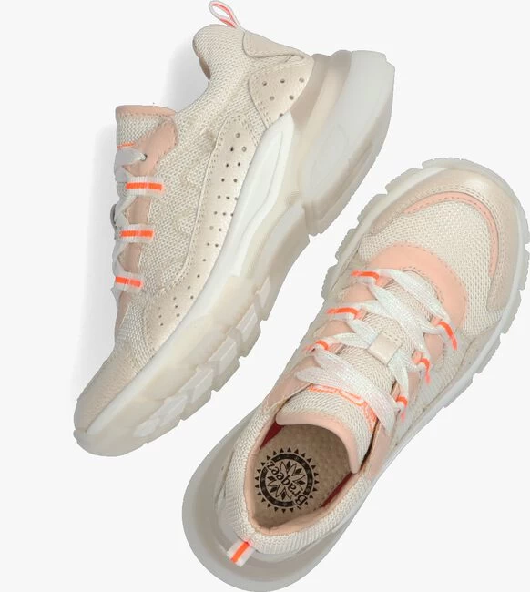 Dit lage sneaker model GWEN GENNA van het merk BRAQEEZ heeft een bovenwerk van zilverkleurig mesh en overlays in roze en parelmoereffect. Opvallende details zijn de perforaties aan de zijkant van de schoen, de oranje accenten, het transparante rubberen zijpaneel en de witte platte veters met holografische afwerking. De tong heeft wit met oranje geborduurd merklogo. Het binnenwerk is gemaakt van leer en heeft een uitneembaar voetbed. De rubberen zool heeft een opvallende look dankzij de speelse vormen en de semi-tranpsparante delen en is voorzien van een gripvast profiel.