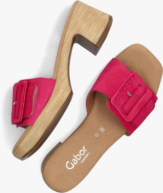 Deze muiltjes 722.3 zijn super trendy voor de zomer! Dit model komt uit de collectie van het merk GABOR en heeft een bovenwerk van roze suède met een beklede siergesp. Onder de gesp zit klittenband bevestigd, zodat hij goed aansluit aan je voet. De voering bestaat uit suèdelook en heeft een dempend voetbed. De houtlook zool maakt dit model helemaal af en het plateau onder de voorvoet is 2,5 centimeter hoog. De hakhoogte is 6 centimeter en is afgewerkt met een kunststof haktip. Dit muiltje staat je altijd goed!