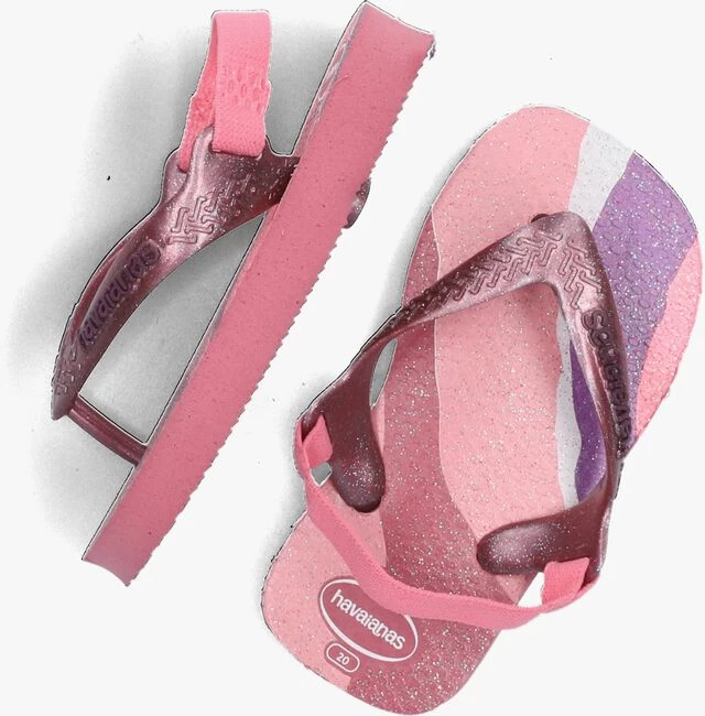Deze slippers BABY PALETTE GLOW van HAVAIANAS zijn altijd fijn! Dit model heeft bandjes van roze rubber met een paars merkembleem. De zool in vrolijke kleuren zijn afgewerkt met glitters. Het roze hielbandje is elastisch, zo blijft het slippertje goed aan je voet zitten. De rubberen zool heeft een gripvast profiel.