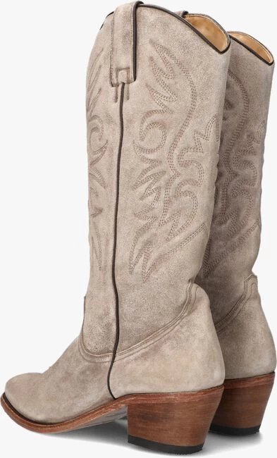 Deze taupekleurige cowboylaarzen HELDEN van NOTRE-V zijn uitgevoerd in hoogwaardig suède met leren accenten. De schacht en voorvoet is voorzien van gestikte cowboy-accenten en je trekt ‘m gemakkelijk aan en uit met behulp van de twee aantreklussen. Het binnenwerk is gevoerd met zeer zacht leer en zorgt samen met het vaste leren voetbed met licht dempende schuimlaag voor een uitstekend comfort. De leren zool is voorzien van rubberen inzetten voor extra grip en is volgens de Goodyear-maakwijze aan de schoen bevestigd. Dit zorgt voor een zeer sterke, duurzame kwaliteit en een stoere uitstraling. De stevige, gelaagde hak is 6 centimeter hoog en voorzien van een rubberen haktip voor een stabiel loopcomfort en de schacht is 32 centimeter hoog.