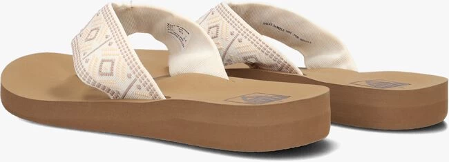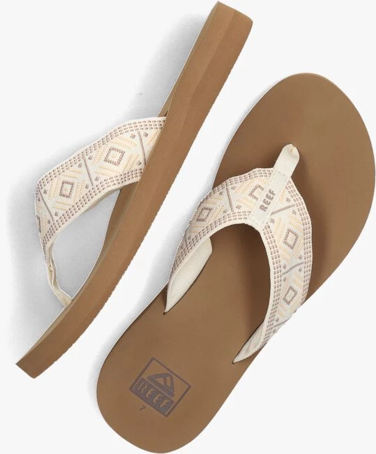 Uit de collectie van het merk Reef is deze heerlijke teenslipper SPRING WOVEN. Dit witte model is voorzien van textiel geweven bandjes met een bruine en lichtgeel borduursel. Het zachte, bruine voetbed is van schuimrubber en heeft een anatomische ondersteuning voor optimaal comfort en demping. De ideale zomerse slipper voor ieder avontuur!