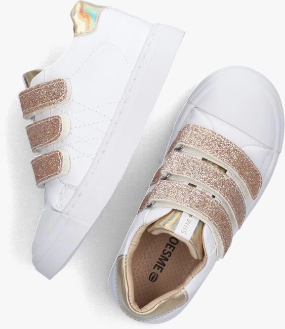 SHOESME is hét merk die weet waar je kinderen mee kunt verrassen. Dat doen ze door hun vrolijke kleurtjes, printjes en door de laatste trends te volgen. Maar zij weten ook precies waar je de ouders blij mee maakt. En dat is natuurlijk een goed voetbed, een goede ondersteuning van de voet én heel belangrijk, dat de schoentjes tegen een stootje kunnen. Deze leuke lage sneaker SH23S016 is zo’n voorbeeld hiervan! De buitenkant is gemaakt van wit leer met een metallic hielcap en een metallic tong met wit merklabel. Dit model heeft drie opvallende en handige klittenbandsluitingen met goudkleurige glitters. Hiermee ervaar je veel gemak bij het aan- en uittrekken en je ze gemakkelijk passend maakt naar het voetje van jouw kind. De neus is voorzien van een witte rubberen stootneus, zo blijven de schoentjes langer mooi, ook als ze nog vaak op de grond spelen. Het binnenwerk is uitgevoerd in leer met een geperforeerd en uitneembaar voetbed voor een optimale ventilatie. De rubberen zool met gripvast profiel is stevig en tegelijkertijd ook soepel zodat de voet goed kan afwikkelen.