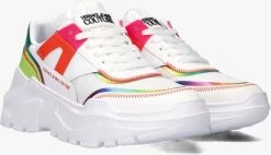 Wil jij met je schoenen een statement maken? Dan zit je met deze lage sneaker FONDO SPEEDTRACK van het merk VERSACE JEANS helemaal goed! Het bovenwerk is uitgevoerd in wit leer met geweven textiel op de voorvoet en heeft regenboog kleuraccenten. Opvallend is de sportieve vorm, de mesh tong met rubberen afwerking, het neongele hielstuk, de regenboog metallic hielcap, de rubberen veterringen en de merkemblemen op de zijkant, tong en hiel. De gewatteerde enkelkraag en tong zorgen samen met de textiel voering en het dempende, uitneembare leren voetbed voor een optimaal comfort. De rubberen, chunky zool is 7,5 centimeter hoog onder de hiel en is licht van gewicht en draagt daardoor ook zijn steentje bij aan een fijn loopcomfort. Het grove profiel onder de loopzool biedt je een uitstekende grip en stabiliteit. Combineer hem met je favoriete jeans en T-shirt voor een sportieve en casual look.