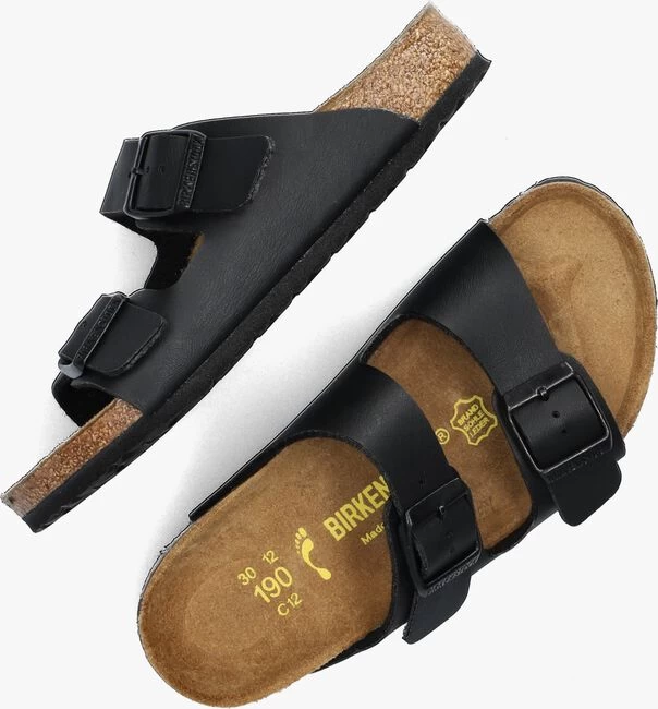 Comfortabele zwarte slippers voor meisjes, 651283, van het merk Birkenstock. De twee riempjes zijn verstelbaar, zo zijn de slippers makkelijk aan- en uit te trekken. De voering is van kurk en de zool is van rubber. Het comfort van deze Birkenstock slipper is erg fijn. Op zonnige dagen is deze slipper met al je zomerse outfits goed te combineren.