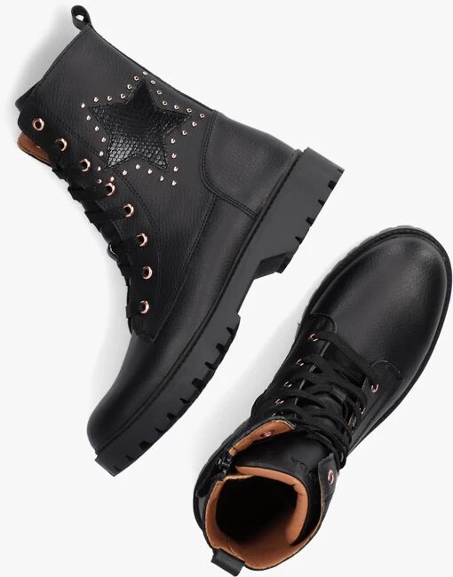 Deze veterboot is van het merk OMODA. De boot past onder vele outfits! Dit model is uitgevoerd in gestructureerd leer en heeft op de schacht een ster van glanzend leer met roségoudkleurige studs. Een leuk detail is de aantreklus aan de hiel en het OMODA reliëf op de tong. De veters zijn zwart met glitters en aan de binnenzijde zit een ritssluiting. De schachthoogte is 17 centimeter. De binnenkant is gemaakt van bruin leer en heeft een zacht uitneembaar voetbed. De rubberen zool heeft een gripvast profiel. Waar combineer jij ‘m mee?