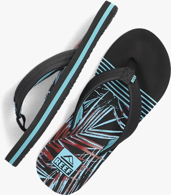 Urenlang speelplezier met deze zwarte AHI slippers van het sportieve merk REEF. Het zwarte bandje heeft een bovenwerk van textiel met een binnenvoering van blauw textiel. In het midden prijkt een rubber merkembleem. Het zachte, voorgevormde voetbed heeft een print van blauwe met rode bladeren en de zool is afgewerkt met een blauwe accentstreep. De loopzool met all-over merkemblemen zorgt voor een uitstekende grip.