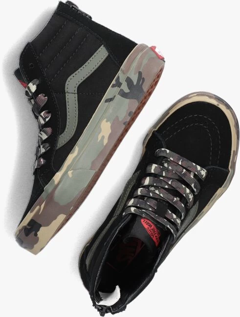 Deze hoge sneaker UY SK8-HI ZIP CAMO SIDEWALL komt uit de collectie van het bekende merk VANS en dit model is gemaakt van zwart textiel met suède accenten op de tong, veterklep en hiel. Verder heeft deze sneaker de welbekende Vans Sidestripe op de zijkant in groen leatherlook, een rood rubber logo op de zoolrand, een textiel merklabel op de tong, camouflage veters, een binnenwerk van leatherlook en een vast voetbed van textiel. Een extra leuk detail is de zwarte rissluiting aan de achterzijde ter versiering. Het vaste voetbed heeft een gecombineerde constructie van schuim en rubber voor de perfecte combinatie van comfort en grip. De gevoerde en doorgestikte enkelkraag biedt ondersteuning en flexibiliteit en de rubberen zool met camouflageprint biedt grip bij het lopen.